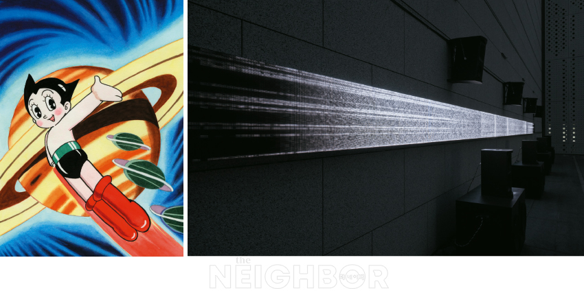 (ÁÂ) ‘Astro Boy’, 1952. © Tezuka Production (¿ì) Ryuichi Sakamoto + Daito Manabe, ‘Sensing Streams 2024–invisible, inaudible (MOT version)’, 2024. Installation view of the exhibition <Ryuichi Sakamoto | seeing sound, hearing time> at the Museum of Contemporary Art Tokyo, 2024. ©2024 KAB Inc. Photo: Takeshi Asano