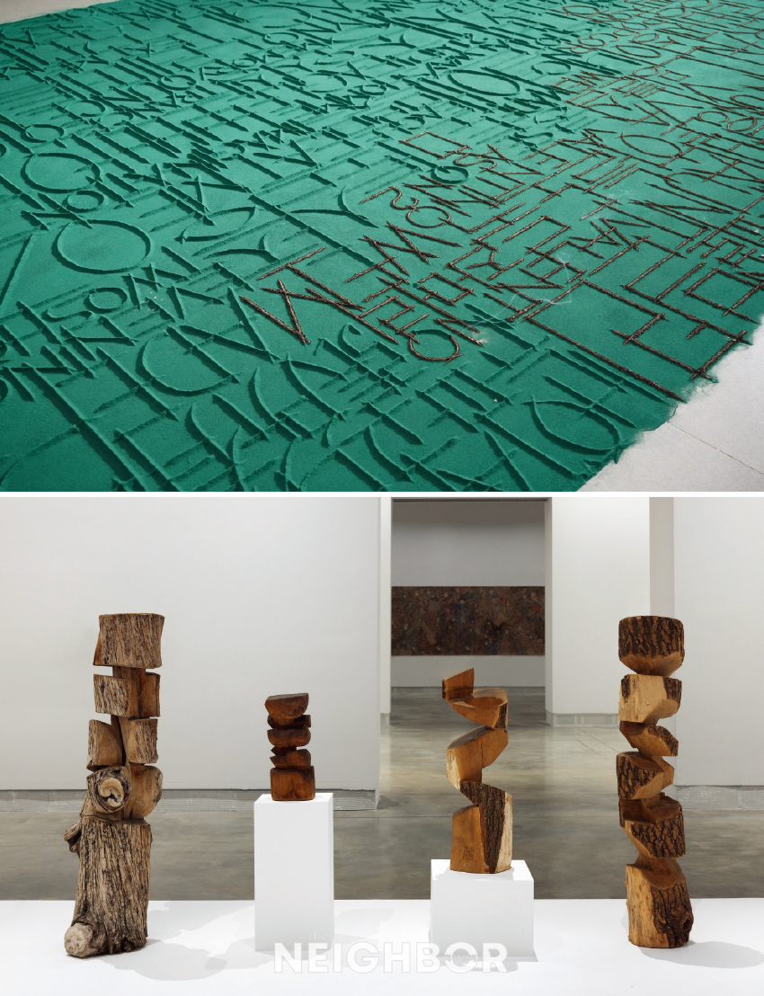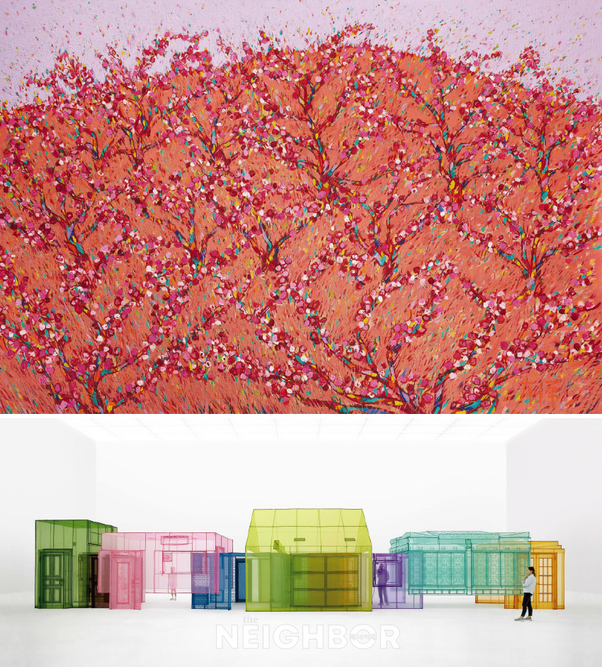 (À§) ÀÌ´ë¿ø, ‘³ó¿ø’, 1983, ĵ¹ö½º¿¡ À¯È ¹°°¨, 112×162cm, ±¹¸³Çö´ë¹Ì¼ú°ü ¼ÒÀå. (¾Æ·¡) ¼µµÈ£, ‘Nest_s’, 2024, 410.1×375.4×2148.7cm, Courtesy by Dohosuh Studio.
