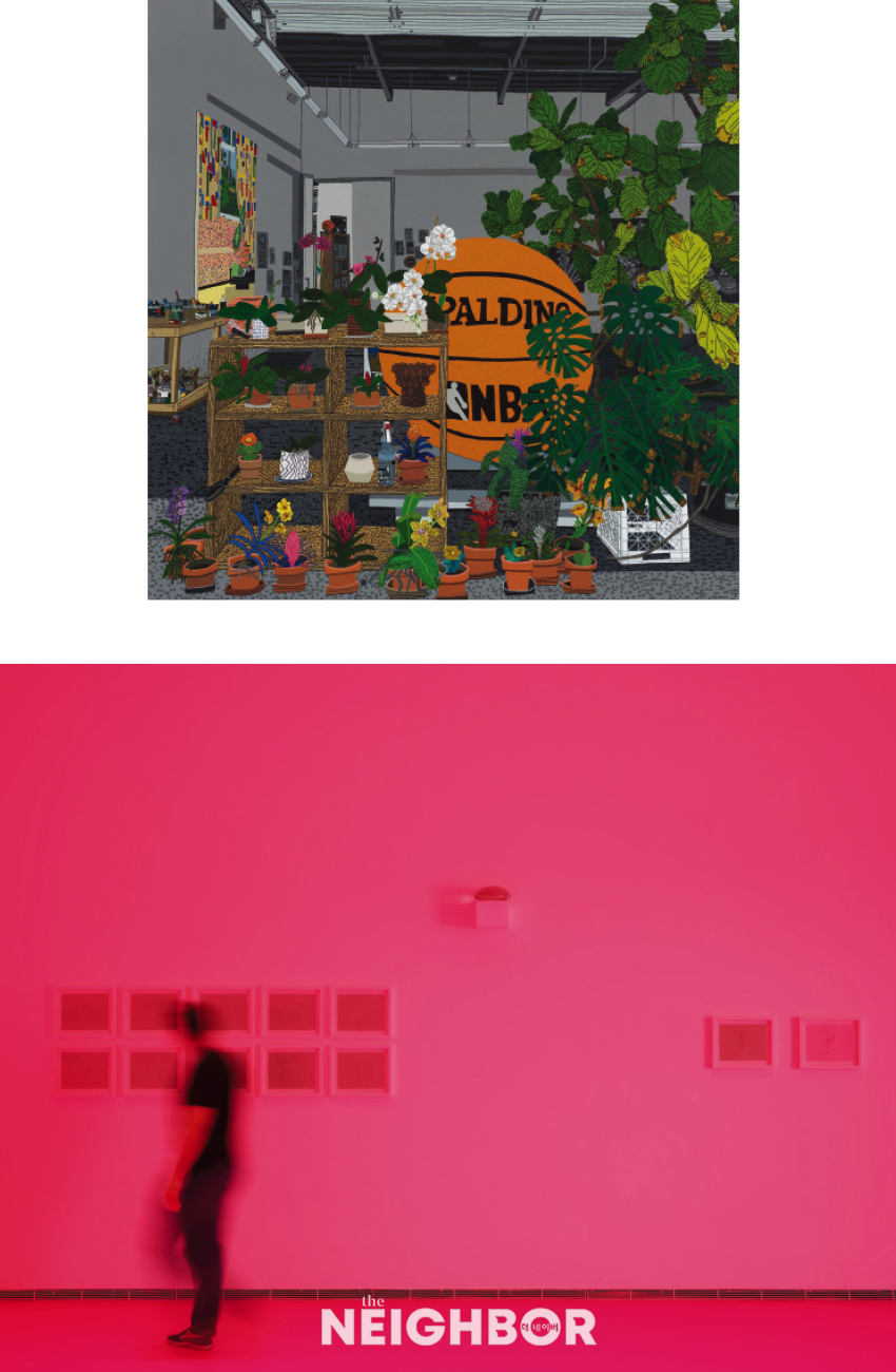 (À§) Jonas Wood, ‘Bball Studio’, 2021, Oil and acrylic on canvas, 279.4×264.2cm. Artwork © Jonas Wood. Photo: Marten Elder. (¾Æ·¡) ±¸Á¤¾Æ, <·£µå ¿Àºê ¿ì¾² [°¼¼]> Àü½Ã Àü°æ, 2025–2026, ·ç¸¶ ¾Æ¸¦, ÇÁ¶û½º. »çÁø: ºòÅÍ & ½Ã¸ó – ±×·¹°í¾Æ ´Ùºí·Ð.