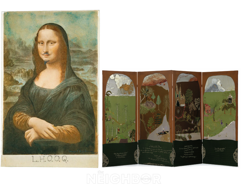 (ÁÂ) Marcel Duchamp. ‘L.H.O.O.Q’., 1919, Pencil on reproduction of Leonardo da Vinci’s Mona Lisa, 19.7×12.4 cm. Private Collection (¿ì) Anna Casparsson, ‘Stories. Little Claus and Big Claus, The story of Little Rosa, The Little Mermaid’, 1947 © Anna Casparsson 2025. Photo: Albin Dahlström/Moderna Museet