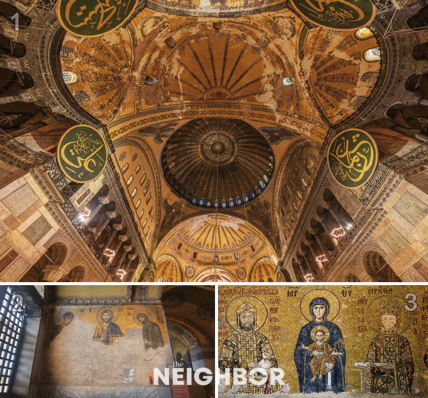 À¯·´°ú ¾Æ½Ã¾Æ, ´Ù¸¥ µÎ ¼¼°è°¡ ¸¸³ª¸é¼ »ý±â´Â ¹®ÈÀû Â÷ÀÌ´Â Á¾±³·Î ±¸Ã¼ÈµÇ¾ú°í, À̸¦ °¡Àå ±ØÀûÀ¸·Î º¸¿©ÁÖ´Â °ÇÃ๰ÀÌ ¹Ù·Î ÇÏ±â¾Æ ¼ÒÇǾÆ(Hagia Sophia) ´ë¼º´çÀÌ´Ù. À̰÷ÀÌ µ¿·Î¸¶ Á¦±¹ÀÇ ¼öµµ ÄܽºÅºÆ¼³ëÇÃÀ̾úÀ» ¶§ÀÎ 537³â, À¯½ºÆ¼´Ï¾Æ´©½º ȲÁ¦´Â ¼¼°è¿¡¼ °¡Àå °Å´ëÇÑ µ¼À» °¡Áø °ÇÃ๰À» Áö¾î ÇÏ´À´ÔÀÇ ¼ºÀü¿¡ ¹ÙÄ£´Ù. ÇÏ±â¾Æ ¼ÒÇǾƶó´Â À̸§µµ ½Å¼ºÇÑ ÁöÇý, Áï ÇÏ´À´ÔÀÇ ÁöÇý¸¦ ÀǹÌÇÑ´Ù. Ȳ±Ý ¸ðÀÚÀÌÅ©¿Í õ»óÀÇ ºûÀÌ ½º¸çµå´Â µ¼Àº Áö»ó¿¡ ±¸ÇöµÈ õ±¹°ú ´Ù¸§¾ø¾ú´Ù.