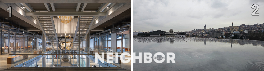 ÇØÇùÀ» µû¶ó À̾îÁö´Â ¹Ù´å°¡¿¡´Â ´º¿å Çö´ë¹Ì¼ú°ü ¸øÁö¾ÊÀº ¸ð´øÇÔÀ» »Ë³»´Â À̽ºÅººÒ Çö´ë¹Ì¼ú°ü(Istanbul Modern)ÀÌ ÀÚ¸®Çϰí ÀÖ´Ù. ¿¾ Ç×±¸ â°í Áö¿ªÀÇ Àç°³¹ß »ç¾÷À¸·Î 2023³â °³°üÇÏ¿´À¸¸ç, °ÇÃàÀº ÆÄ¸® ÆþÇǵΠ¼¾ÅÍ, ¹ÙÁ© ¹ÙÀÌ¿¤·¯ ¹Ì¼ú°ü µîÀ» ÁöÀº À¯¸í °ÇÃà°¡ ·»ÃÊ ÇǾƳ밡 ¸Ã¾Ò´Ù. °Å´ëÇÑ Á÷¼± ÇüÅÂÀÇ Çö´ë °ÇÃàÀÌÁö¸¸ ¹àÀº »ö À¯¸®¿Í ¾Ë·ç¹Ì´½ ÆÐ³ÎÀ» »ç¿ëÇÏ¿© À§¼¼¸¦ °ú½ÃÇϱ⺸´Ù´Â ÁÖº¯ dz°æÀ» ºñÃß´Â ¹è°æÃ³·³ Á¸ÀçÇÑ´Ù. ¼¼ °³ Ãþ ¸ðµÎ »çÀÌ»çÀÌ·Î ¹Ù´Ù¸¦ ¹Ù¶óº¼ ¼ö ÀÖµµ·Ï ¼³°èµÇ¾úÀ¸¸ç, ƯÈ÷ ¿Á»óÀº ¹Ù´Ù¿Í ¾ð´ö, ±×¸®°í °÷°÷¿¡ ¼Ú¾Æ ÀÖ´Â ¸ð½ºÅ©±îÁö ÇÑ´«¿¡ ´ã±â´Â Àü¸ÁÀ» ¼±»çÇØ °¨ÅºÀ» ÀھƳ½´Ù. ¿Á»ó À§¿¡ ¾è°Ô Á¶¼ºµÈ ¼ö¸éÀº ÁÖº¯ dz°æÀ» °Å¿ïó·³ ¹Ý»çÇϰí, »õµé¸¶Àú ÇÑ ÆøÀÇ ±×¸²Ã³·³ ´À²¸Áú Á¤µµ´Ù. Ä÷º¼Ç ¿ª½Ã ¿Ã¶óÆÛ ¿¤¸®¾Æ½¼ °°Àº ¼¼°èÀûÀÎ ÀÛ°¡ÀÇ ÀÛǰºÎÅÍ Æ¢¸£Å°¿¹ Çö´ë¹Ì¼ú¿¡ À̸£±â±îÁö Æø³Ð°Ô ¼Ò°³Çϰí ÀÖ´Ù.