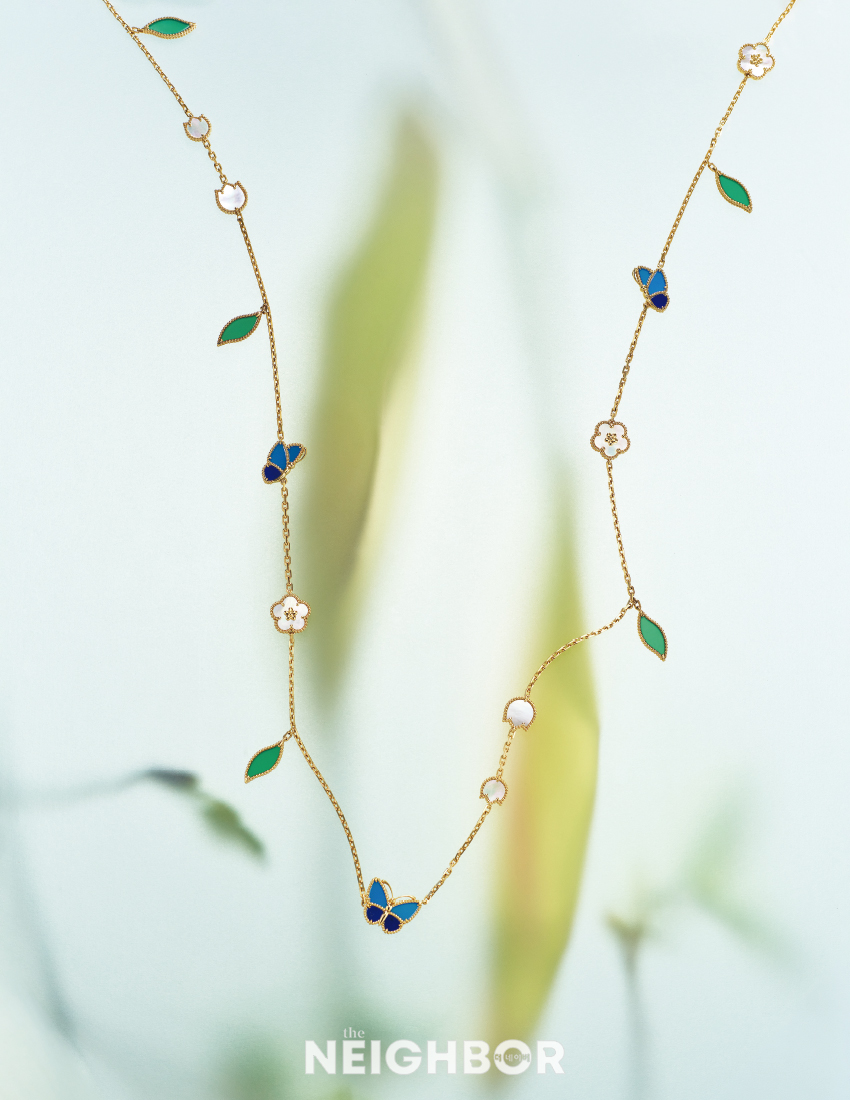 Van Cleef&Arpels ¶óÇǽº¶óÁÙ¸®, ºí·ç ¾Æ°ÔÀÌÆ®, ±×¸° ¾Æ°ÔÀÌÆ®, ÈÀÌÆ® ¸¶´õ¿ÀºêÆÞ µîÀ¸·Î Àå½ÄÇÑ ÃÑ 15°³ÀÇ ¸ðƼÇÁ¸¦ ¼¼ÆÃÇÑ ¿»·Î °ñµå ¼ÒÀçÀÇ ·°Å° ½ºÇÁ¸µ ·Õ ³×Å©¸®½º. °¡°Ý ¹ÌÁ¤.